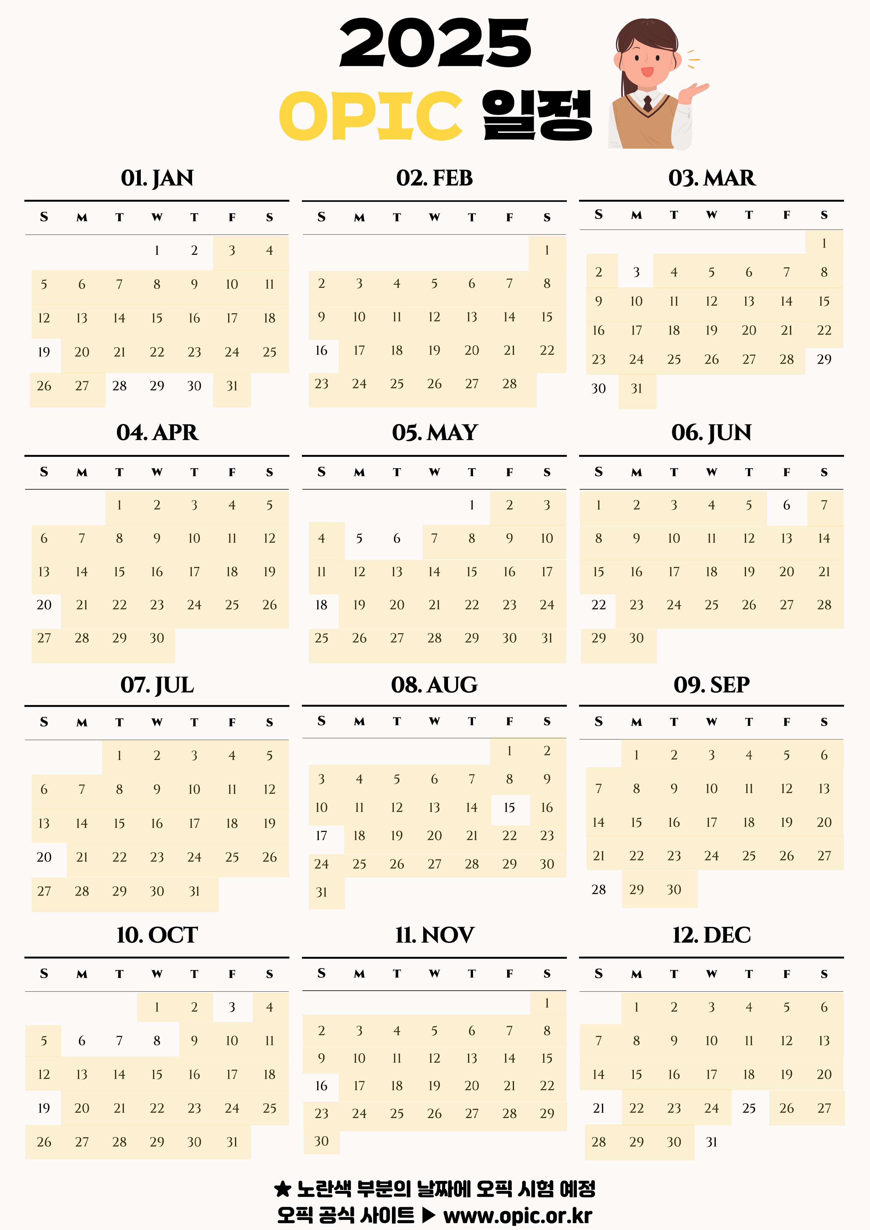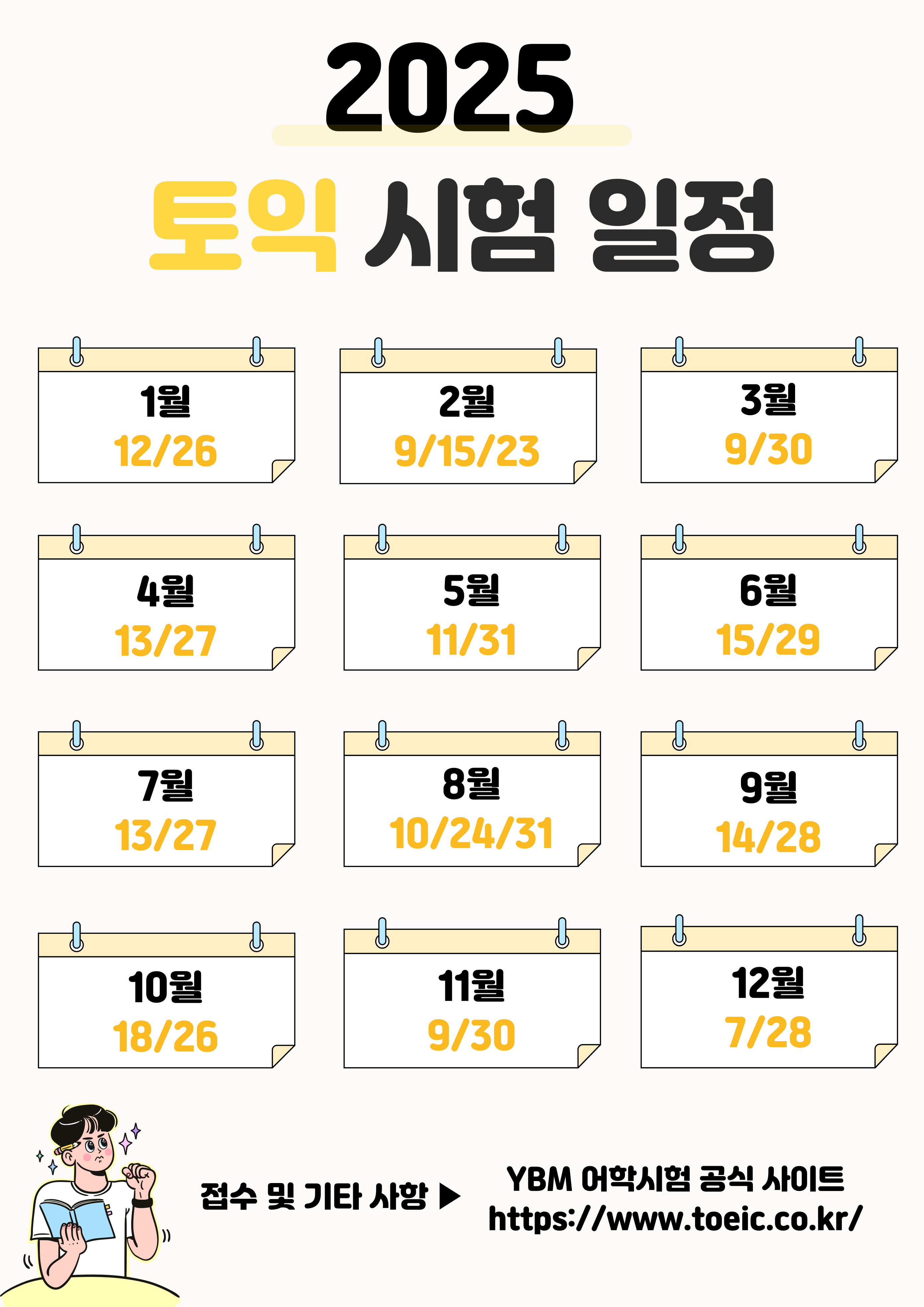 안녕하세요! 토익사관학교에서 2025년도 토익,오픽 정기시험 일정을 아래와 같이 안내드리니 수강생 여러분은 일정 참고하시어 시험준비 바랍니다.